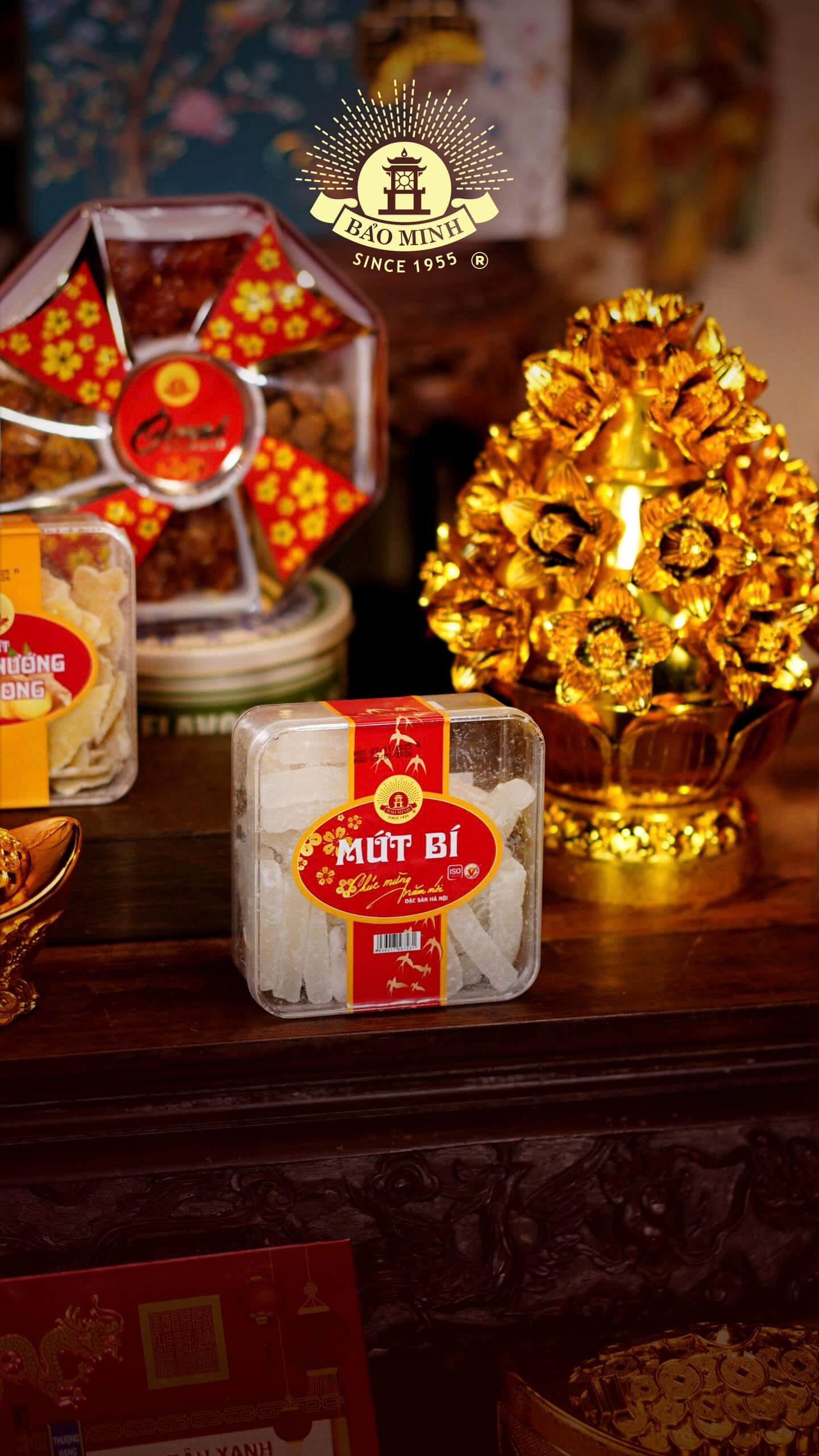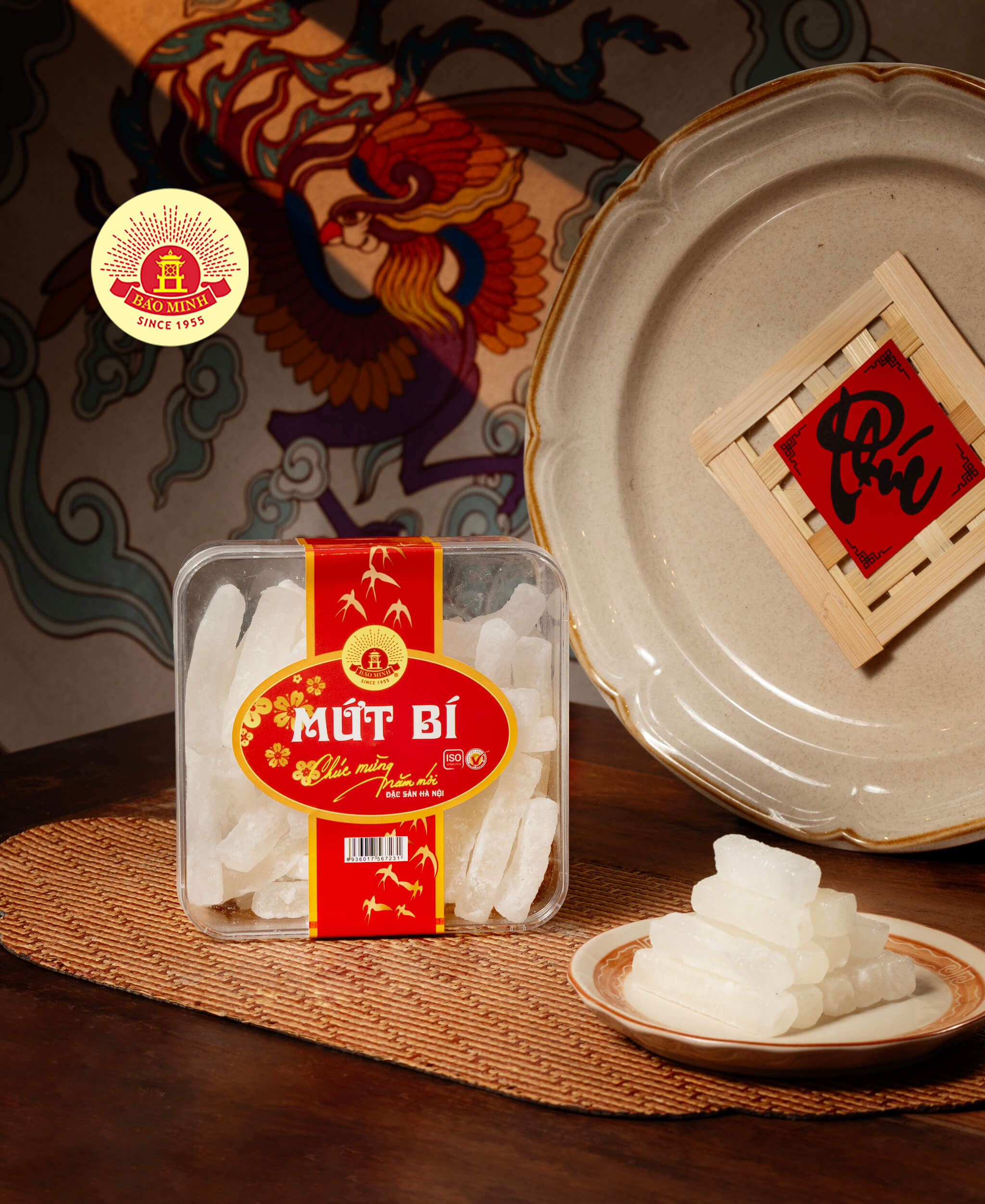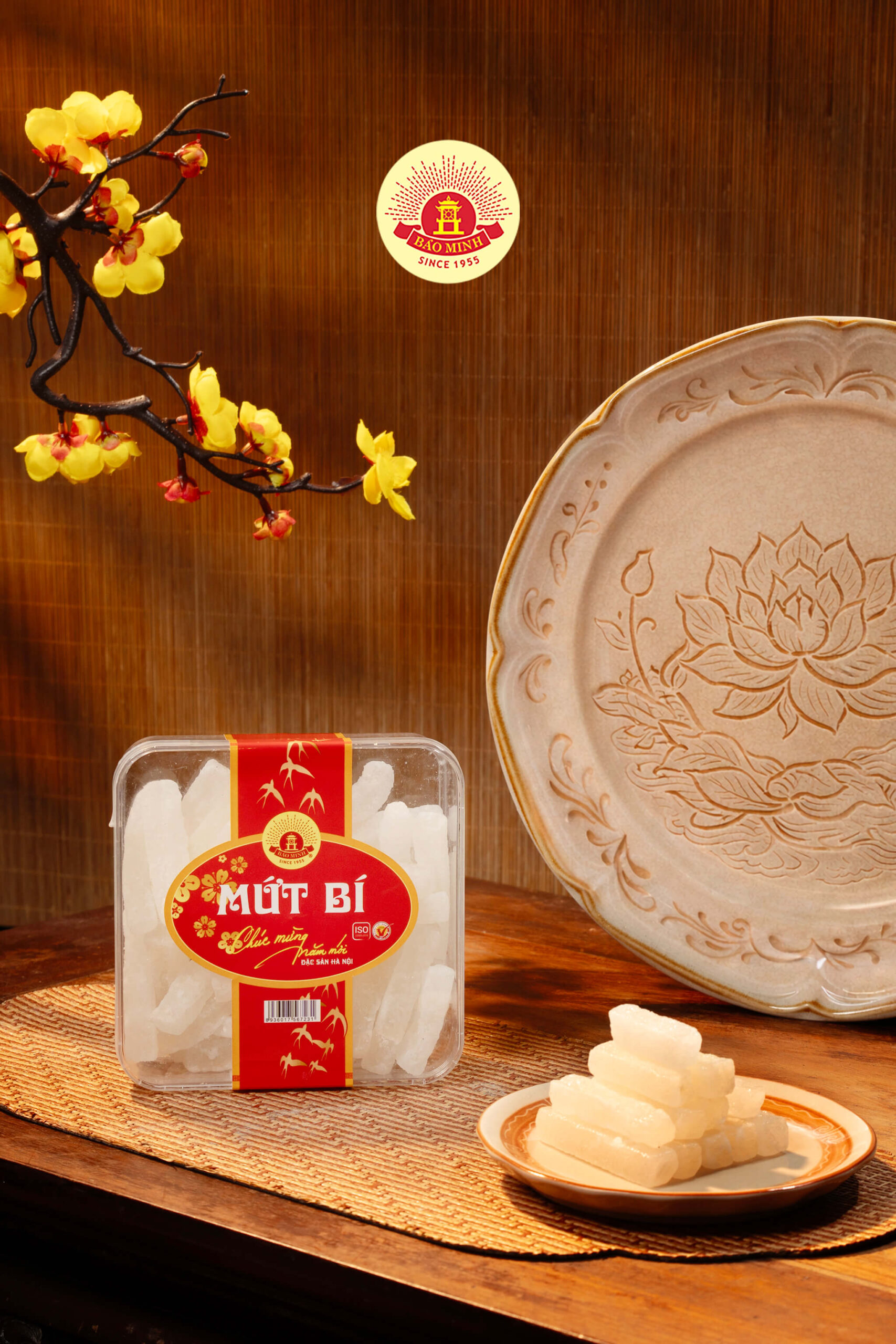 Mứt Bí dẻo giòn sần sật, thanh mát vị Xuân có truyền thống từ lâu đời. Tại các làng nghề ướp mứt cổ của miền Bắc, nơi người thợ xưa tận dụng bí đao sau những vụ mùa lớn, một loại quả thanh lành đặc trưng mùa hè, và vốn là loại quả dễ trồng, lại có thể bảo quản lâu. Từ kỹ thuật trần, rim, sấy công phu, miếng bí trở nên dẻo giòn, giữ được sắc trắng tinh khiết và hương vị mộc mạc & tao nhã, tạo nên thức mứt trắng trong, giòn nhẹ và ngọt thanh cho ngày Tết.