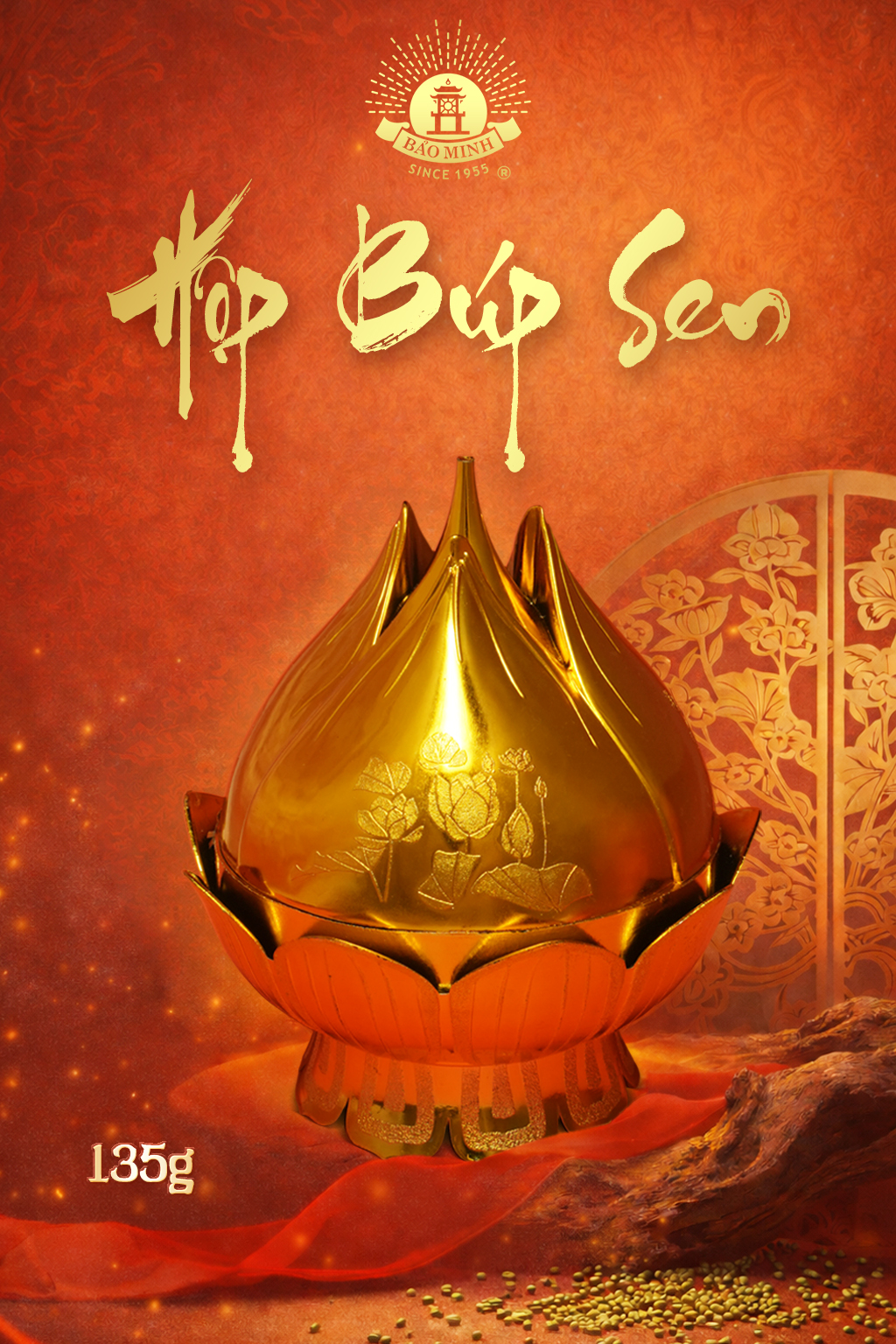 Hộp Búp Sen là mẫu hộp bánh Bảo Minh được thiết kế dành riêng cho dịp Lễ Tết. Bao bì với thiết kế bắt mặt dạng hộp búp sen vàng sang trọng, bên trong là những hộp bánh đậu xanh Rồng vàng Bảo Minh.